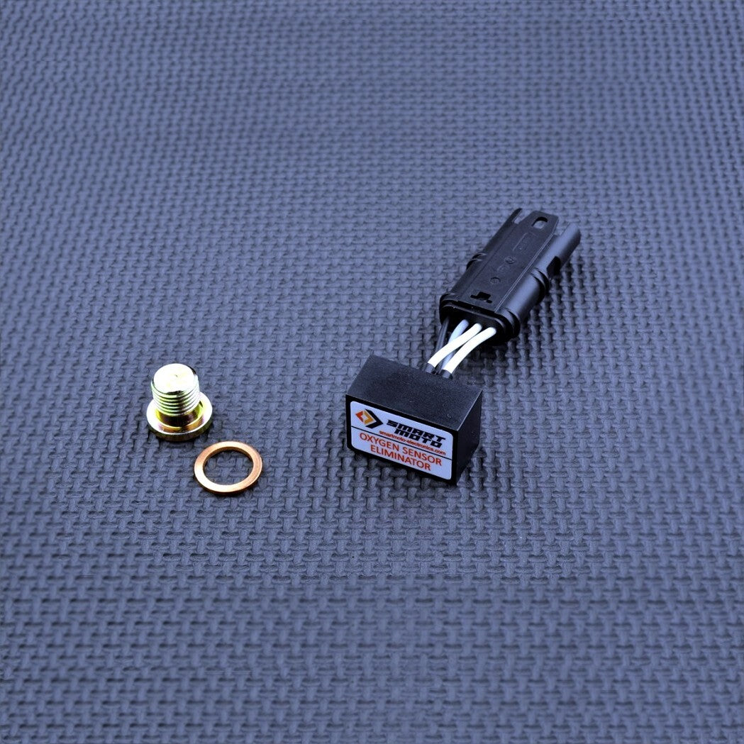 The SmartMoto E5 O2 Sensor Eliminator Kit replaces the factory oxygen sensor in a motorcycle's exhaust. The kit allows the bike's ECU to bypass the limitations of the oxygen sensor system and use the installed air-fuel map. This results in improved throttle response, smoother power delivery, plus more torque available in the low and mid RPMs.